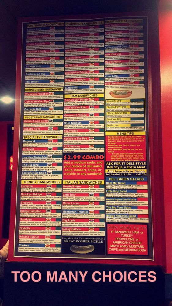 ⁄ lb all beef “Nathan’s Famous” Hot Dog with tomato, pickle spear, onions, spicy mustard, relish, on a hero roll